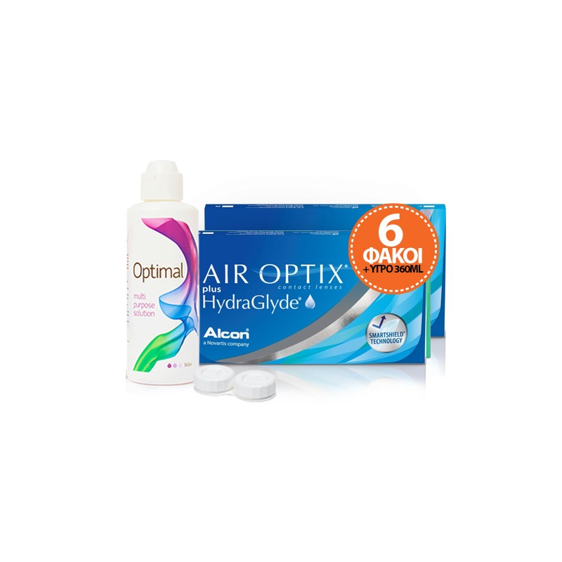 Πακέτο Economy, 2 κουτιών AIR OPTIX® plus HydraGlyde® με 3 φακούς το κάθε κουτί και υγρό Optimal 360ml.