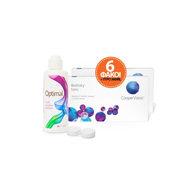 Πακέτο Economy, 2 κουτιών Biofinity της CooperVision με 3 φακούς το κάθε κουτί. Σύνολο 6 φακοί μαζί με υγρό Optimal 360 ml !!!