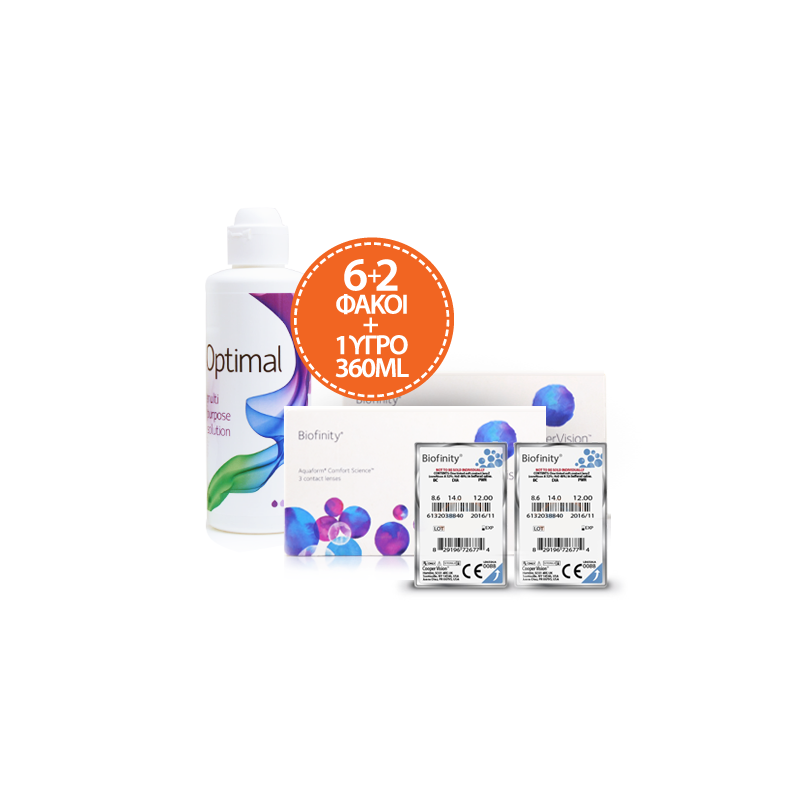 Economy Package, 2 boxes of Biofinity by CooperVision, each containing 3 lenses, along with 2 additional lenses. Total of 8 lenses with Optimal 360 ml solution!!!