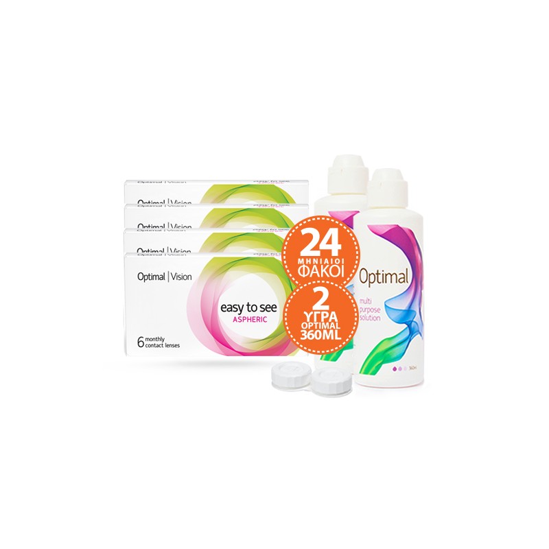 Economy Package, 4 boxes with 6 lenses each + 2 bottles of Optimal solution totaling 720ml.